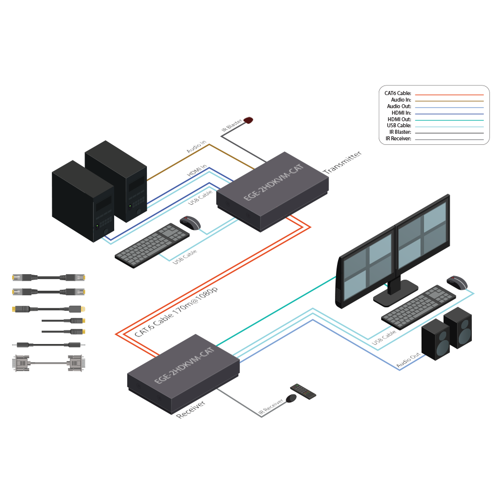 The EGE-2HDKVM-CAT is a high performance KVM (Keyboard, Video and Mouse) extender that allows a customer to have full console control at 170 meters (1080p resolution) remote. The flexibility of CAT.5e/6 cables makes this easily routable and is an inexpensive method for extending a full KVM console. It can transmits two HDMI digital video streams, USB Keyboard/Mouse, IR, RS-232 and stereo audio via two CAT.5e/6 cables. In operation, EGE-2HDKVM-CAT is truly plug and play, capturing full EDID data from the display ensuring your hardware is always setup to deliver optimal display performance. It is optimized for applications at industrial control, security, KVM extension.