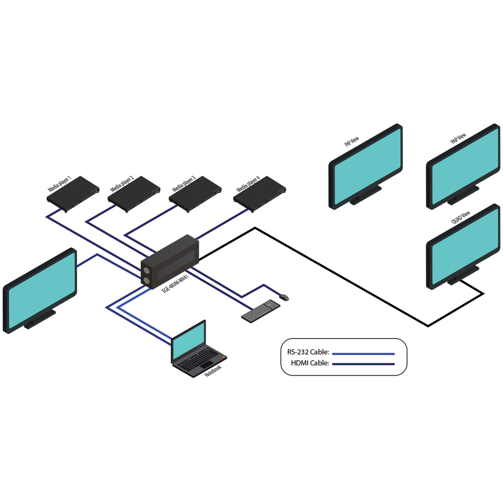 The 4K MultiView KVM Switch is a standalone device which designed to meet the requirement of multi-task. It allows the user to simultaneously monitor up to four HD HDMI multimedia sources on a single HDTV and upscale the resolution up to 4K. Meanwhile, a PC connection is supported, user can also fully access, control and reboot the connected computer through this switch. 4K is a new standard of display which delivering four times the resolution of Full HD. The EGE-4KVM-MV41 series support various input as long as built-in an HDMI connection and upscale the resolution up to 4K. It means the images can be demonstrated sharper and contain more details using the EGE-4KVM-MV41 series.
