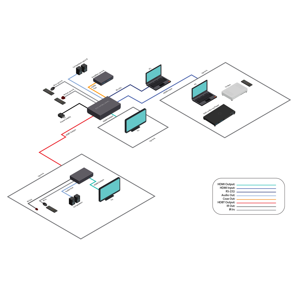 The 18Gbps 8×8 HDBaseT(150M) Matrix can connect 8 HDMI sources to 16 displays. It features 8 HDMI outputs and each HDMI output is mirrored to provide a CAT-Cable output which runs simultaneously. HDBaseT output can extend video transmission distance up to 492ft / 150m via a single Cat 5e/6/7 cable and the resolution is up to 4K2K@60Hz 4:4:4. Audio de-embedded to analog and coaxial audio is supported. Each HDMI output supports 4K2K to 1080P downscaler independently. The product supports IR matrix. The IR signal is one-to-one control at the Matrix end, but the IR signal follows HDMI video channel at the HDBaseT