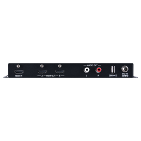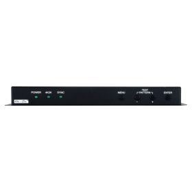 The 1 by 2 UHD Scaler with Audio De-Embedded is designed to upscale 1080p signal into 4K2K 6G or downscale 4K2K 6G signal into 1080p with synchronized digital and analog audio output. Friendly and simple design that allow user with direct viewing on input HDMI content and OSD that ease user with output settings/selection. Scaling signal up to 2 simultaneous HDMI output with two different resolutions or generate patterns to output display with assigned resolution allowing on-site display testing. This UHD Scaler is the best define tool between your HD and UHD signal.