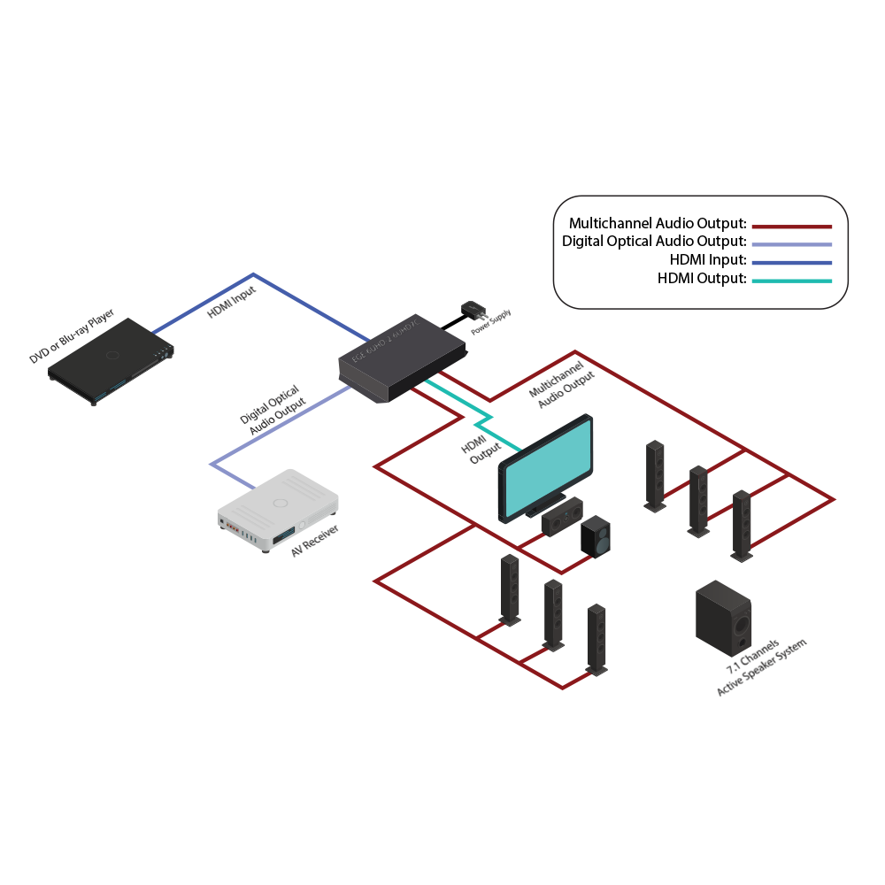 The HDMI 4K 6G LPCM 7.1 Channel Audio Extractor could extract audio signals from your HDMI source. The unit allows you to extract original HDMI audio signal and convert it to digital optical or analog multi-channel audio. Further, both input and output HDMI support UHD resolution up to 4K2K@60Hz (YUV444), and capable of provide high quality of audio and video performance. It supports HDMI high resolution digital audio formats by pass, also LPCM 7.1CH, Dolby TrueHD, Dolby Digital Plus, Dolby Atmos and DTS-HD Master Audio, audio sampling rate up to 192 kHz, allowing a full enjoyment over synchronize video and audio.