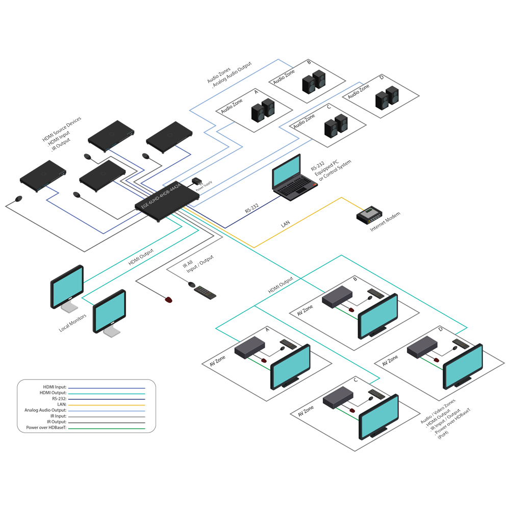 This 4×6 HDMI/HDBaseT Matrix supports routing and transmission of video (resolutions up to 4K@60Hz w/ HDMI 2.0 & HDCP 2.2) and audio (multi-channel digital/stereo analog) while providing flexible control via IR, RS-232, Telnet or WebGUI. As many as four HD sources may be routed to any of six destinations via a single Cat.5e/6/7 cable (up to 60m at 1080p or up to 40m at 4K@30Hz). The two HDMI 2.0 outputs support transmission of 6G UltraHD HDMI sources (up to 4K@60Hz, 4:4:4) from any HDMI input or they can mirror any of the HDBaseT outputs for local monitoring. 3D video is also supported when compatible sources and displays are connected. This product supports passing 7.1 channel LPCM digital audio as well as advanced bitstream and HD bitstream audio formats. Additionally, four analog audio outputs are available to provide stereo breakout audio from the associated HDBaseT output (LPCM 2.0 sources only). The Power over HDBaseT (PoH) function can power compatible receivers, providing greater flexibility in your installations. Control is via manual selection buttons, WebGUI, Telnet, RS-232 or IR remote