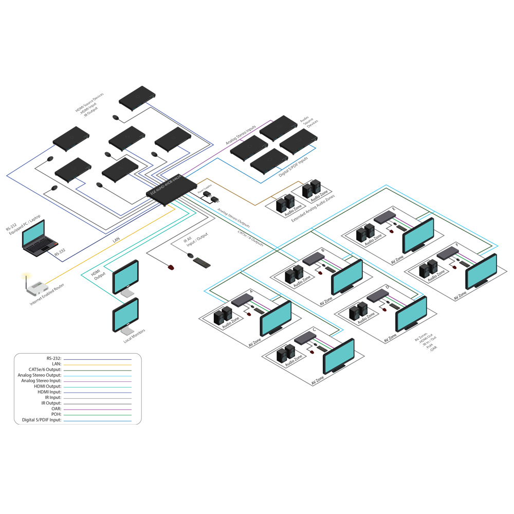 This 6×8 HDMI and HDBaseT Matrix supports routing and transmission of video (resolutions up to 4K@60Hz w/ HDMI 2.0 & HDCP 2.2) and audio (multi-channel digital/stereo analog) while providing flexible control via IR, RS-232, Telnet or WebGUI. As many as six UltraHD sources may be routed to any of eight destinations, six via single Cat.5e/6/7 cables (up to 60m at 1080p or up to 35m at 4K@30Hz) and two via HDMI 2.0 outputs. The two HDMI 2.0 outputs support transmission of 18Gbps UltraHD HDMI sources (up to 4K@60Hz, 4:4:4) from any HDMI input or they can mirror any of the HDBaseT outputs for local monitoring. 3D video is also supported when compatible sources and displays are connected. This product supports passing 7.1 channel LPCM digital audio as well as advanced bitstream and HD bitstream audio formats. Additionally, six analog audio outputs are available to provide stereo breakout audio from the associated HDBaseT output (LPCM 2.0 sources only). Beyond basic video routing, this product also incorporates an independent audio matrix with eight audio outputs and four audio inputs. Offering discrete audio routing, insertion and extraction, this product makes it possible to have multiple audio zones within your installation. This product supports the Optical Audio Return (OAR) channel feature, found on compatible HDBaseT receivers, allowing optical audio sources connected to those receivers to be sent back to the matrix unit. Internally generated test patterns (up to 18Gbps UHD resolutions) are provided to assist with setup, providing a simple way to verify both matrix and sink functionality. The Power over HDBaseT (PoH) function can power compatible receivers, providing greater flexibility in your installations. Control is via manual selection buttons, WebGUI, Telnet, RS-232 or IR remote.