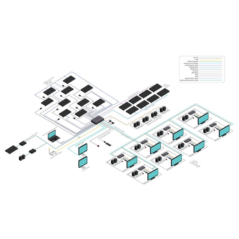 This 10×10 HDMI/HDBaseT Matrix supports routing and transmission of video (resolutions up to 4K@60Hz w/ HDMI 2.0 & HDCP 2.2) and audio (multi-channel digital/stereo analog) while providing flexible control via IR, RS-232, Telnet or WebGUI. As many as ten HD sources may be routed to any of eight destinations via a single Cat.5e/6/7 cable (up to 100m at 1080p or up to 60m at 4K@30Hz). The two HDMI 2.0 outputs support transmission of 6G UltraHD HDMI sources (up to 4K@60Hz, 4:4:4) from any HDMI input or they can mirror any of the HDBaseT outputs for local monitoring. 3D video is also supported when compatible sources and displays are connected. This product supports passing 7.1 channel LPCM digital audio as well as advanced bitstream and HD bitstream audio formats. Additionally, four analog audio outputs are available to provide stereo breakout audio from the associated HDBaseT output (LPCM 2.0 sources only). Beyond basic video routing, this product also incorporates an independent audio matrix with 14 audio outputs and 10 audio inputs. Offering discrete audio routing, insertion and extraction, this product makes it possible to have multiple audio zones within your installation. Additionally the matrix contains 3 independent audio mixers allowing for applications such as adding music or a voice over to existing video. This product supports the Optical Audio Return (OAR) channel feature, found on compatible HDBaseT receivers, allowing optical audio sources connected to those receivers to be sent back to the matrix unit. LAN support allows your 100BaseT network to be extended to smart TVs or game consoles. Internally generated test patterns (up to 6G UHD resolutions) are provided to assist with setup, providing a simple way to verify both matrix and sink functionality. The Power over HDBaseT (PoH) function can power compatible receivers, providing greater flexibility in your installations. Control is via manual selection buttons, WebGUI, Telnet, RS 232 or IR remote.
