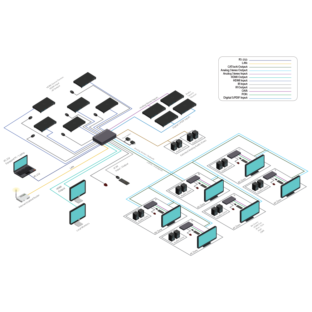 This 6×8 HDMI and HDBaseT Matrix supports routing and transmission of video (resolutions up to 4K@60Hz w/ HDMI 2.0 & HDCP 2.2) and audio (multi-channel digital/stereo analog) while providing flexible control via IR, RS-232, Telnet or WebGUI. As many as six UltraHD sources may be routed to any of eight destinations, six via single Cat.5e/6/7 cables (up to 60m at 1080p or up to 35m at 4K@30Hz) and two via HDMI 2.0 outputs. The two HDMI 2.0 outputs support transmission of 18Gbps UltraHD HDMI sources (up to 4K@60Hz, 4:4:4) from any HDMI input or they can mirror any of the HDBaseT outputs for local monitoring. 3D video is also supported when compatible sources and displays are connected. This product supports passing 7.1 channel LPCM digital audio as well as advanced bitstream and HD bitstream audio formats. Additionally, six analog audio outputs are available to provide stereo breakout audio from the associated HDBaseT output (LPCM 2.0 sourcesonly). Beyond basic video routing, this product also incorporates an independent audio matrix with eight audio outputs and four audio inputs. Offering discrete audio routing, insertion and extraction, this product makes it possible to have multiple audio zones within your installation. This product supports the Optical Audio Return (OAR) channel feature, found on compatible HDBaseT receivers, allowing optical audio sources connected to those receivers to be sent back to the matrix unit. Internally generated test patterns (up to 18Gbps UHD resolutions) are provided to assist with setup, providing a simple way to verify both matrix and sink functionality. The Power over HDBaseT (PoH) function can power compatible receivers, providing greater flexibility in your installations. Control is via manual selection buttons, WebGUI, Telnet, RS-232 or IR remote.