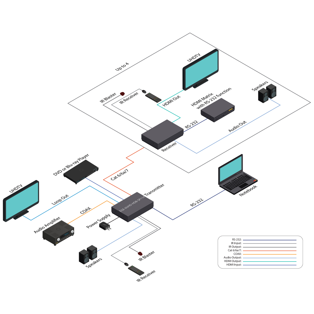 This 18Gbps HDMI 1×4 HDBaseT Splitter can distribute 1 source signal to any 4 display devices. Support video resolution up to 4K2K@60Hz 4:4:4. It is designed with 1 HDMI loop output and 4 HDBaseT outputs. The HDMI signal transmission distance can be extended up to 120 meters at the resolution of 4K2K@60Hz, or 150 meters at 1080P@60Hz via a single CAT6/ 6a/7 cable. The product supports IR and RS-232 signal pass-through, audio extract function and advanced EDID management.