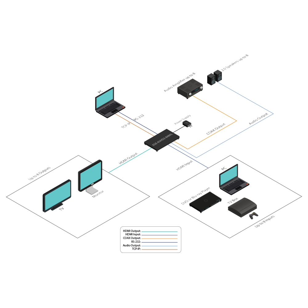 The 18Gbps 8×8 HDMI Matrix supports the transmission of video (up to 4K2K@60Hz YUV 4:4:4) and multi-channel high resolution digital audio from 8 HDMI sources to 8 HDMI displays. Audio de-embedded to analog and coaxial audio is supported from 8 HDMI output ports. While HDMI output ARC function is enabled, the ARC audio from HDMI display devices will be extracted to coaxial audio output. Each HDMI output of this 8×8 HDMI Matrix supports 4K2K to 1080P downscaler independently. Control is via front panel buttons, IR remote, RS-232, LAN and Web GUI