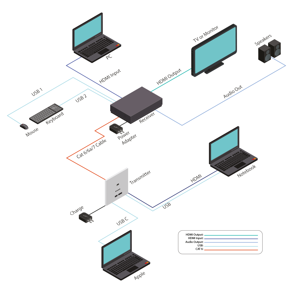 The wall plate is a 2×1 switcher and HDBaseT transmitter with HDMI and USB-C input. It features a US one-gang enclosure for Decora-style wall plate openings with interchangeable black and white wall plates and faceplates. The USB-C input provides an ideal AV interface for connecting with new Apple notebooks and Windows® PCs as well as smartphones and tablets. Support video resolution up to 4K@60Hz 4:4:4. The product is remotely powered by the receiver or other HDBaseT-equipped devices via POE.