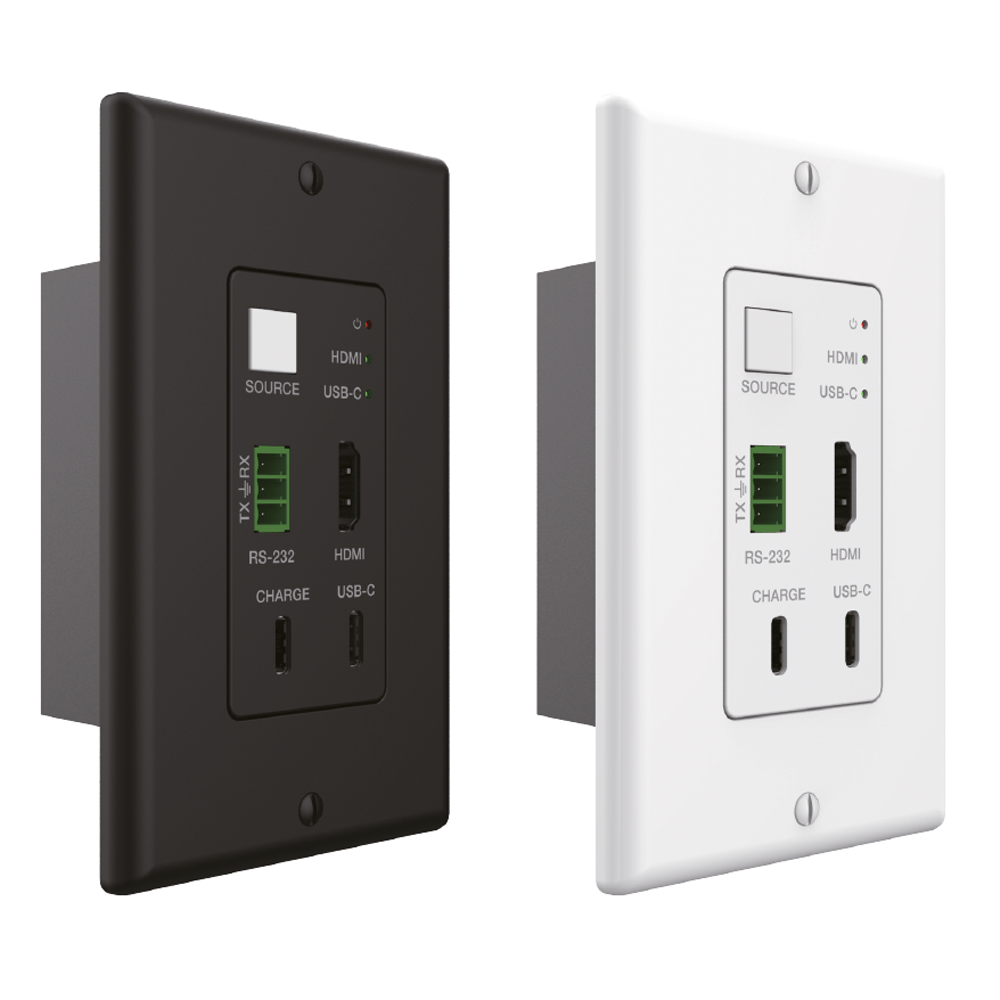 The wall plate is a 2×1 switcher and HDBaseT transmitter with HDMI and USB-C inputs. It features a US one-gang enclosure for Decora-style wall plate openings with interchangeable black and white wall plates and faceplates. Support video resolution up to 4K2K\@50/60Hz 4:4:4. It supports bidirectional RS-232 pass-through, and the RS-232 control signal can be transmitted up to 131ft / 40m. The product is remotely powered by the receiver or other HDBaseT-equipped devices via POE.