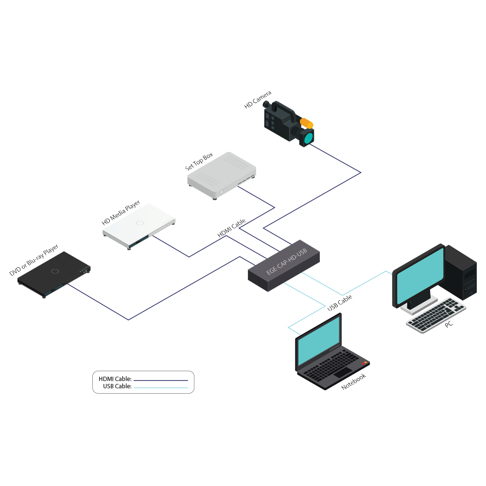 EGE-CAP-HD-USB is High Definition capture box supports HDMI 1080p video input and record to H.264 video format. Its low power consumption and superior video processing capabilities make it ideal for integration into high-end portable and desk top PC products.