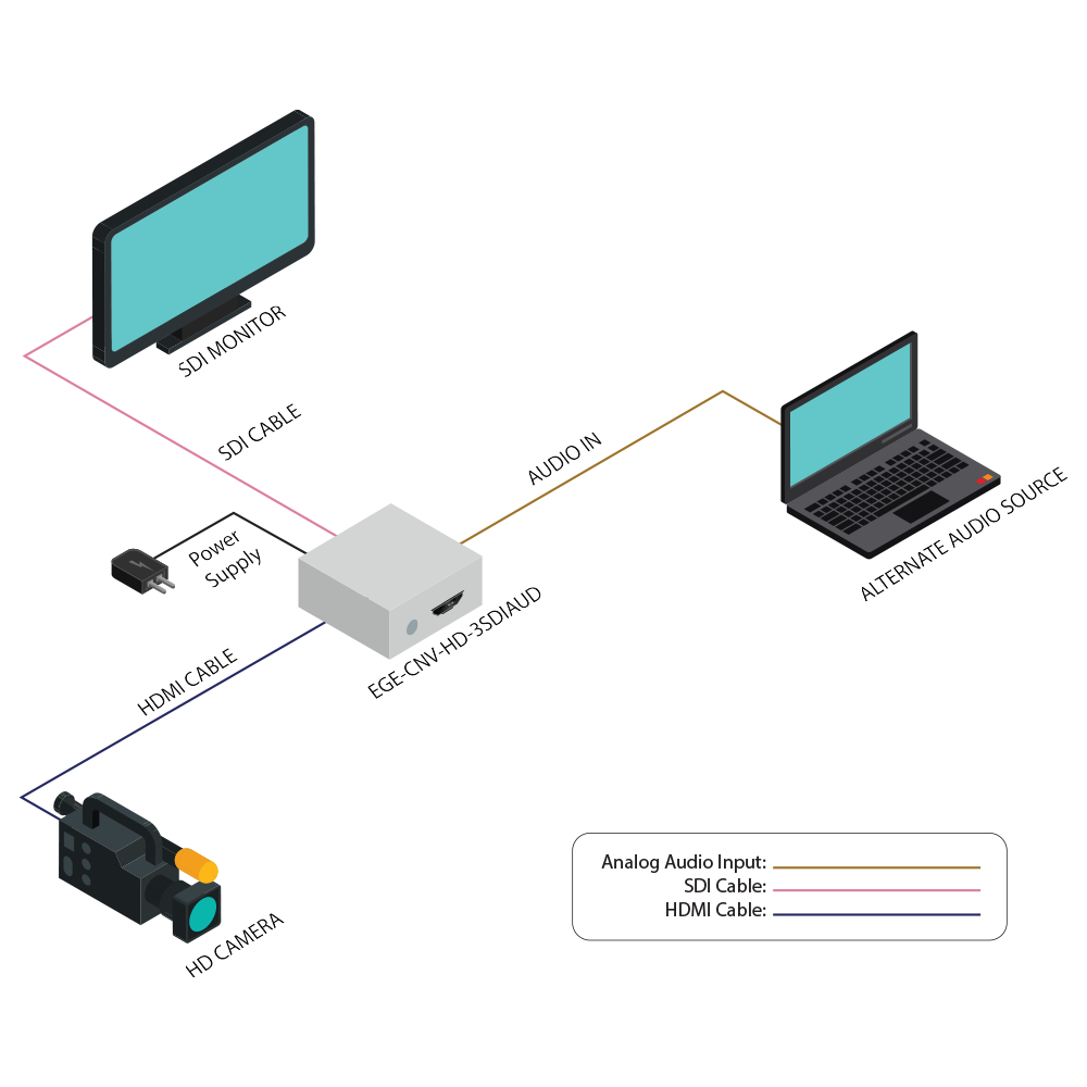 The HDMI to SDI Converter allows HDMI signals to be shown on SDI display while ensuring high bit rates of 2.970 Gbit/s to give you high resolution signal without any loss. For professionals this means that it is now easier to convert your high def HDMI signal with audio to SDI for long distance transmission and display your work on SDI display. In addition, the external audio input allows the user to insert the sound from a different audio source instead of the HDMI embedded audio, and send to the SDI output.