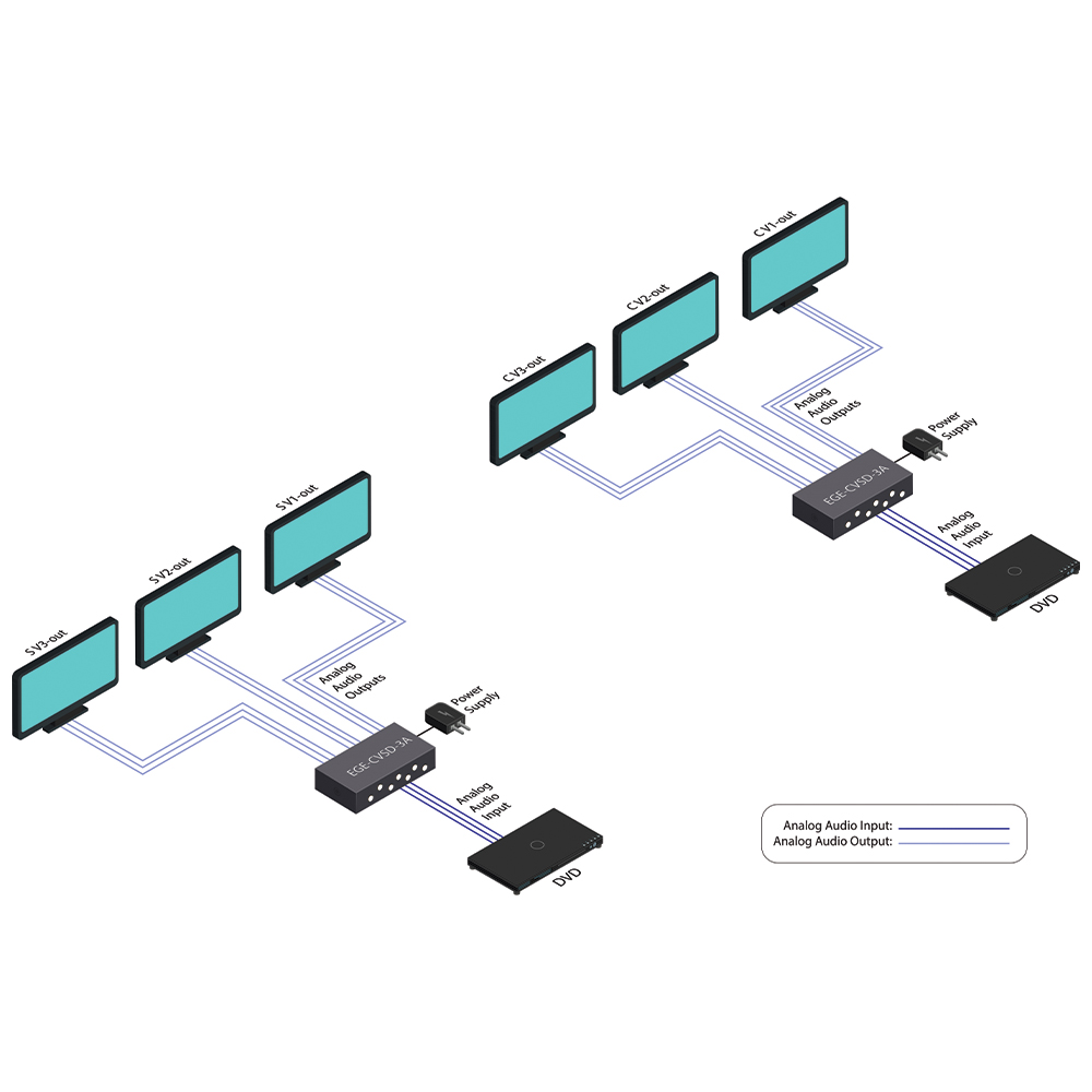 The EGE-CVSD-3A is the combination of a 1×3 CV and 1×3 SV Distributionamplifier with stereo. It accepts one CV and one SV input at the same time and delivers 3 buffered and isolated outputs for each of the CV and SV input. When the CV and SV come from the same source, the EGE-CVSD-3A becomes a 1-in 6-out distributor.
