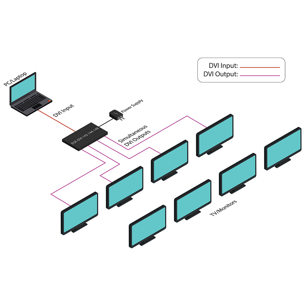 The DVI Splitter series are high performance, HDCP compliant DVI distribution amplifiers. It allows one DVI signal source to be split to two, four or eight identical buffered outputs for connecting to up to eight DVI displays simultaneously. These models can be used to transfer HDMI signal by using HDMI to DVI adaptor or cable. Each of the buffered outputs can be run up to 15 meters and can be cascaded