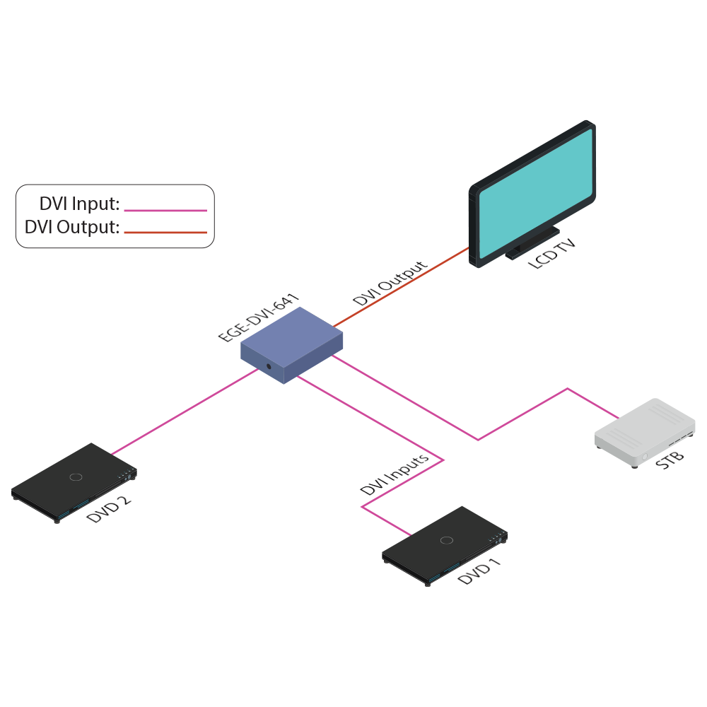 EGE-DVI-641 is a high performance DVI switcher with remote control. It allows your various DVI sources to share one DVI display. Simply pressing one button to select your desired DVI source for display on the HDTV.