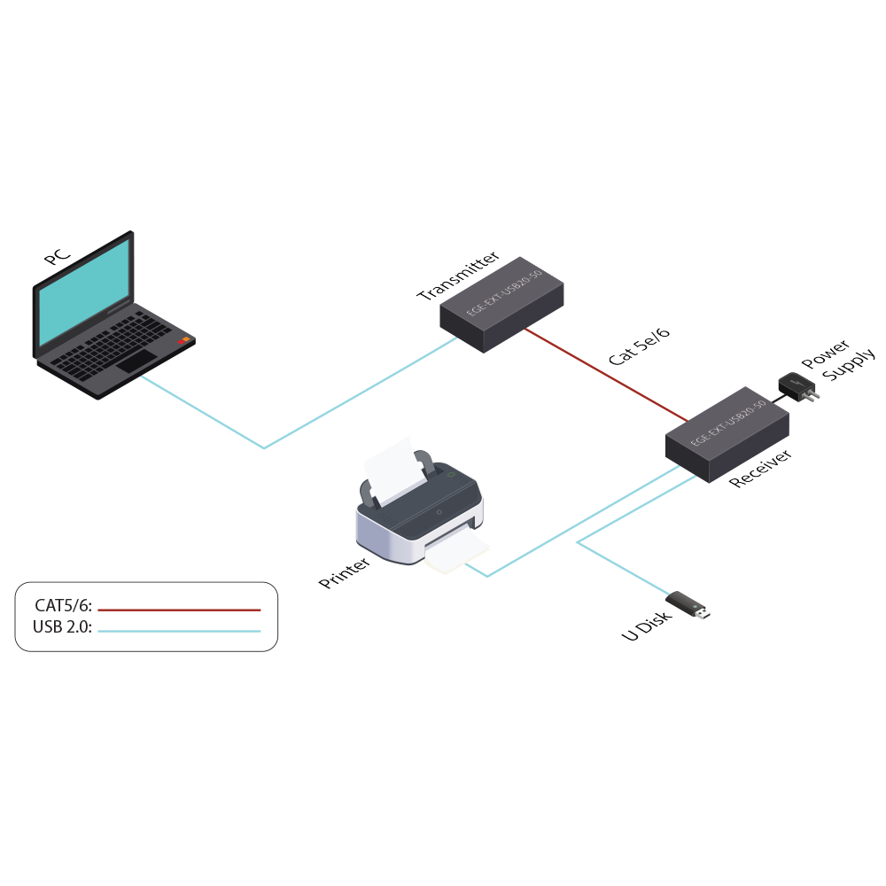The USB 2.0 Extender can extend USB signal up to 50 meters / 164ft via Cat 5e/6 cable (The transmission distance can only up to 40 meters / 131.2ft for some USB 2.0 Hub ). In transmitter, the USB-B port is connected a PC. In receiver, you can connect a device with USB port at the two USB ports such as U disk or printer, etc. In addition, you need to connect 5V/1A power supply to receiver. The product can be widely used long distance signal transmission between a PC and USB device. Simple plug and play, no drive and setting installation required.