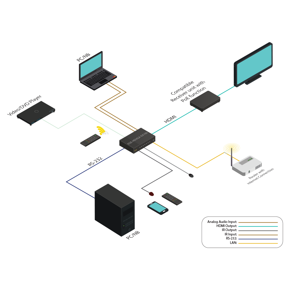 The HDMI/PC video scaler with LAN/IR/RS-232/Bidirectional PoE over Single CAT5e/6/7 transmitter can send uncompressed audio/video over a single run of CAT5e/6/7 cable up to 100 m with Bidirectional PoE feature. The system supports various ways of control that can be done through on-panel buttons, IR remote, RS-232, and OSD. The device provides full range of output resolutions through CAT5e/6/7 up to 1080p for HDTV timing and WUXGA(RB) for PC timing.
