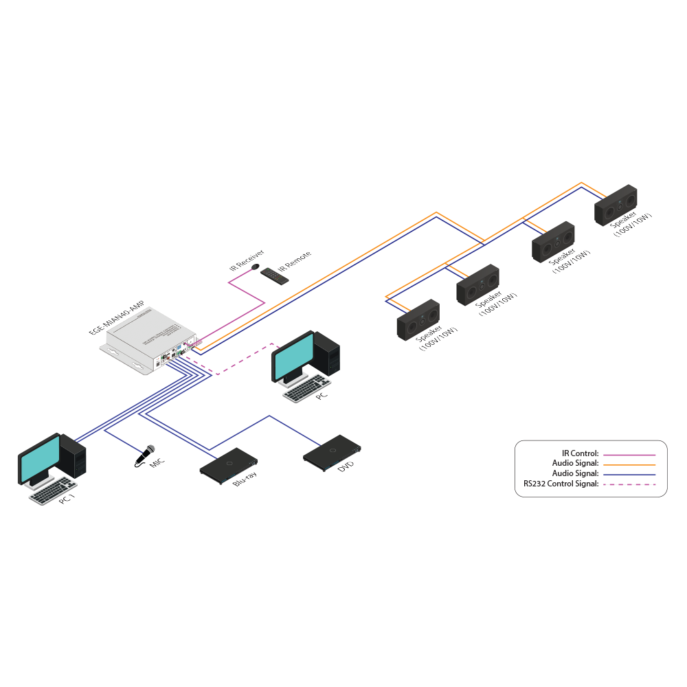 The product is a 40 Watt power amplifier (Class-D) with output alternatively at 70V or 100V. It has 2 stereo inputs (1×3.5mm jack for line in, 2xRCA for L&R), 1 digital input & 1 balanced MIC. It is integrated with powerful functions, including ducking function, EQ control, MIC mixer etc., and MIC input supports 3 levels with condenser MIC, dynamic MIC & line audio input. As for power amplifier we have normally voltages at 70V and 100V for different countries, but the amplifier is designed to integrate with both voltages to meet different requirements.