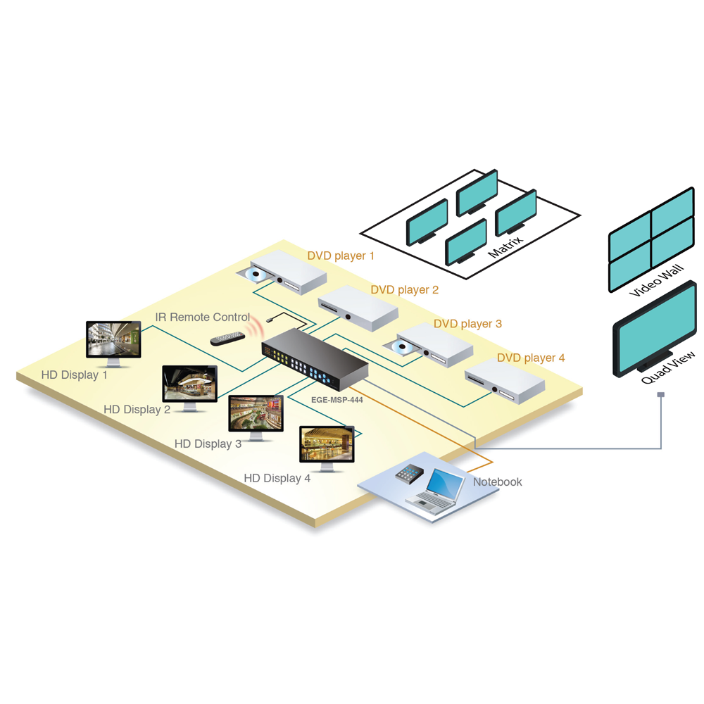 EGE-MSP-444, 4 x 4 Smart HDMI A/V Processor is the only complete independent HDMI system that arrange four HDMI multimedia sources and dynamically exhibit them on 4 displays in various mode. Each source can be independently scale. Switching do not have delays or black screen. It is the ideal solution for A/V Switching, Splitting, or Broadcasting.