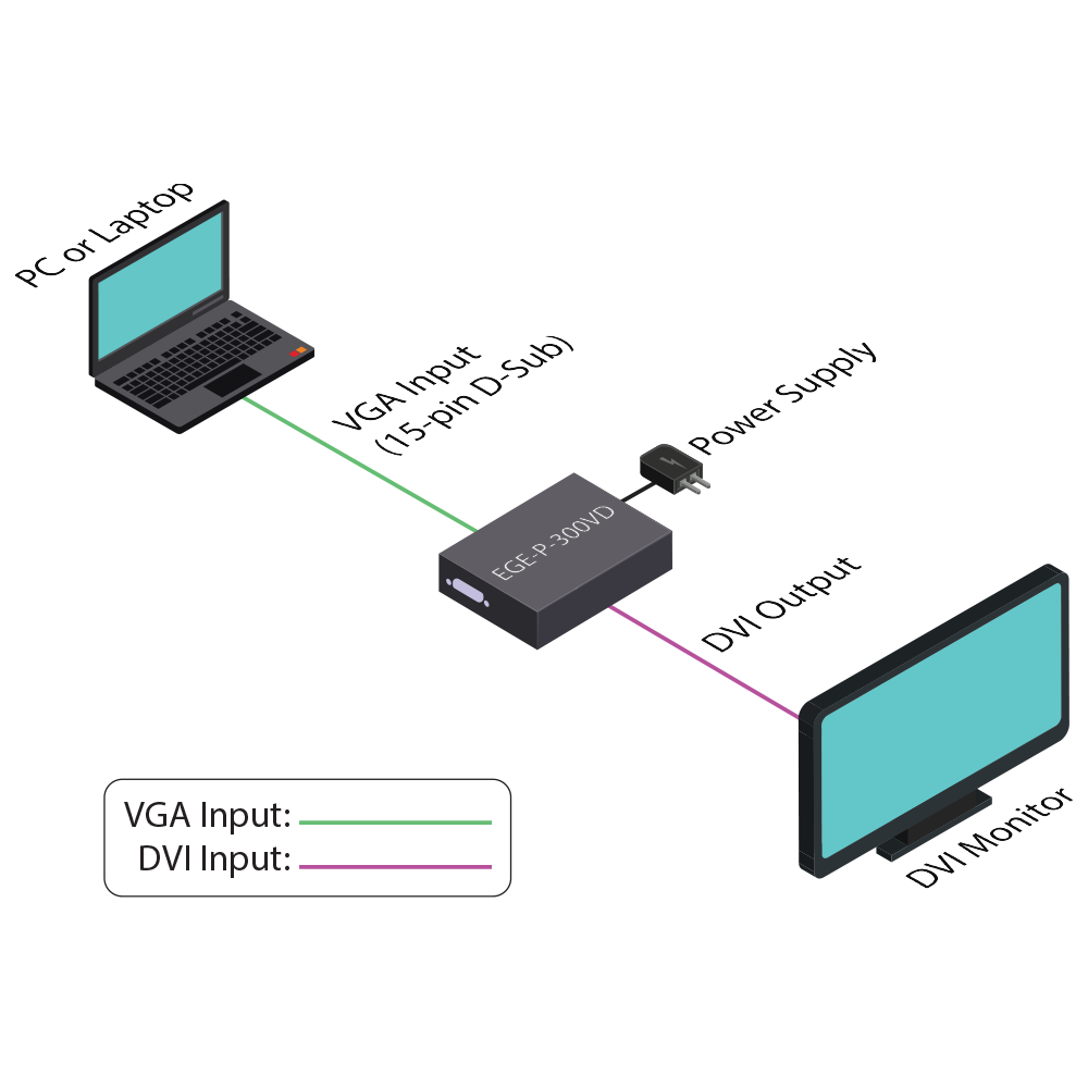 The VGA to DVI Scaler is designed to convert a VGA signal to DVI so that it can be displayed on a DVI monitor without loss of image quality. It can upscale VGA input sources to DVI output for a wide-range of PC resolutions, from VGA to WUXGA. The Scaler has a variety of output resolutions and adjustment for the best picture quality. Also, the built-in OSD function makes it easy for the user to view or select the desired resolution.