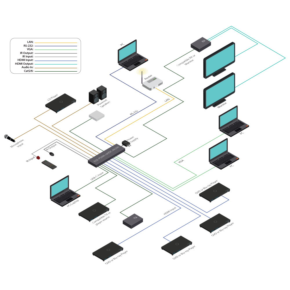 This 9 by 2 multi-format scaling switcher provides HDMI, USB-C, HDBaseT, and VGA inputs which can be freely selected for output at a scaled resolution of the user’s choosing over the mirrored HDMI and HDBaseT outputs. The HDMI and USB-C ports support resolutions up to 4K@60 (4:4:4, 8-bit) while the HDBaseT output supports automatic color subsampling of 4K50/60(4:4:4) sources to 4K50/60(4:2:0). The VGA inputs support resolutions up to WUXGA. The HDBaseT output provides a great solution to extend your audio and video up to 100 meters over a single run of Cat.6A cable as well as providing PoH power to compatible HDBaseT Transmitters and Receivers. This unit also includes multiple analog stereo audio inputs and a microphone input along with an amplified analog stereo output to provide a range of audio routing and mixing flexibility. The built-in audio mixer function allows the user to mix audio from any LPCM 2.0 source with the microphone input for presentation or lecture usage. The ability to switch back and forth between mixed and non-mixed audio greatly simplifies the presentation experience. A trigger input interface is also provided to allow the easy addition of a remote control keypad, or other trigger-supporting products, which can be installed within a podium or within a table in a conference room or classroom. This interface can allow the user to activate functions with the simple press of a button. Standard control is available via front panel buttons with an OnScreen Display (OSD), WebGUI, Telnet, and RS-232 making it exceptionally versatile.