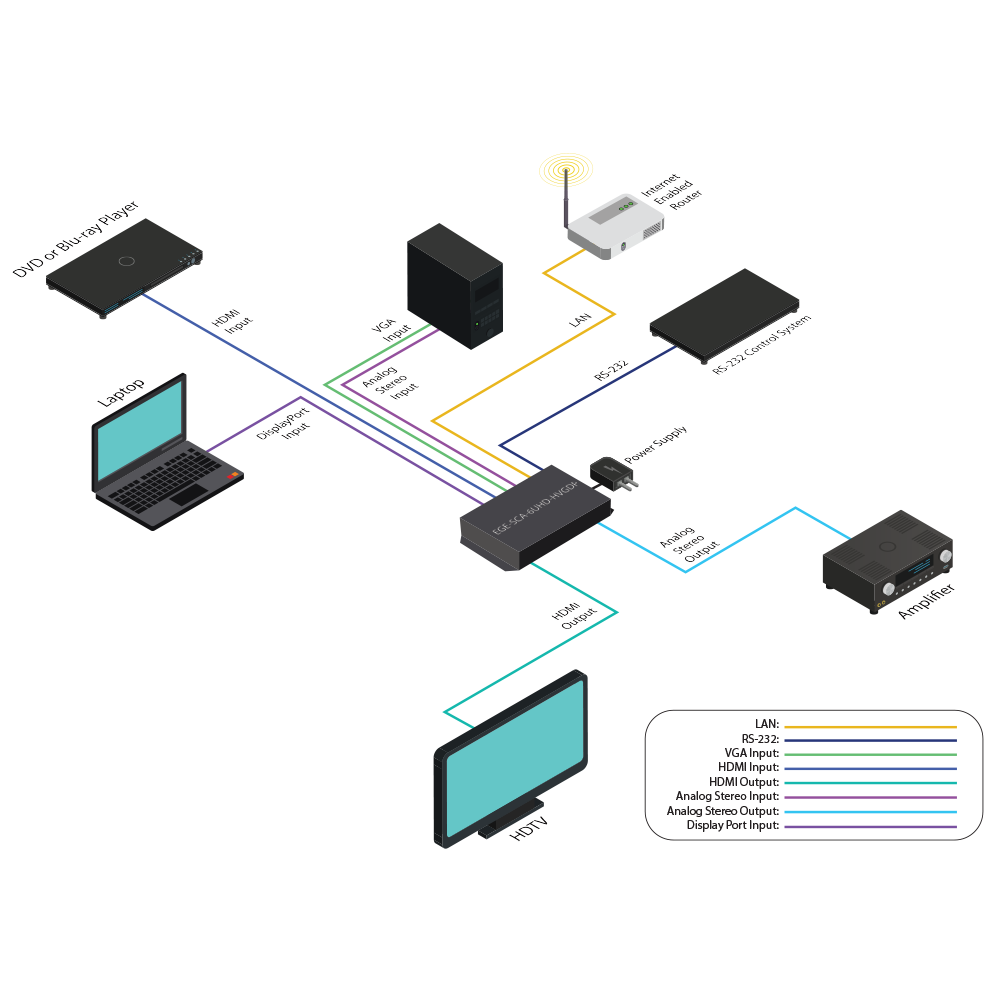 This multi-format scaler features the three most popular input interfaces utilized on source devices: HDMI, DisplayPort and VGA. This unit is an ideal solution for use in conference rooms and showrooms and for any customer who has a requirement to match disparate input sources to the native resolution of a display. The maximum output resolution supported is 4K@60Hz YUV 4:4:4 for both HDMI and DisplayPort inputs. This unit comes packed with all of the adjustment options you are likely to need when accommodating different sources including a wide array of aspect ratio settings as well as contrast, brightness, saturation, hue, sharpness, etc. all adjustable directly on the unit. Additionally this unit brings the benefit of an analog speaker output for ease of integration when employed in conference centers, classrooms and public venues. The auto source detection feature is designed to switch to the most recently connected source automatically and to switch to another live input if the current one becomes disconnected. This unit is controllable via front panel controls (with OSD), WebGUI, IR remote, telnet and RS-232. These comprehensive control interfaces make operation easy and intuitive.