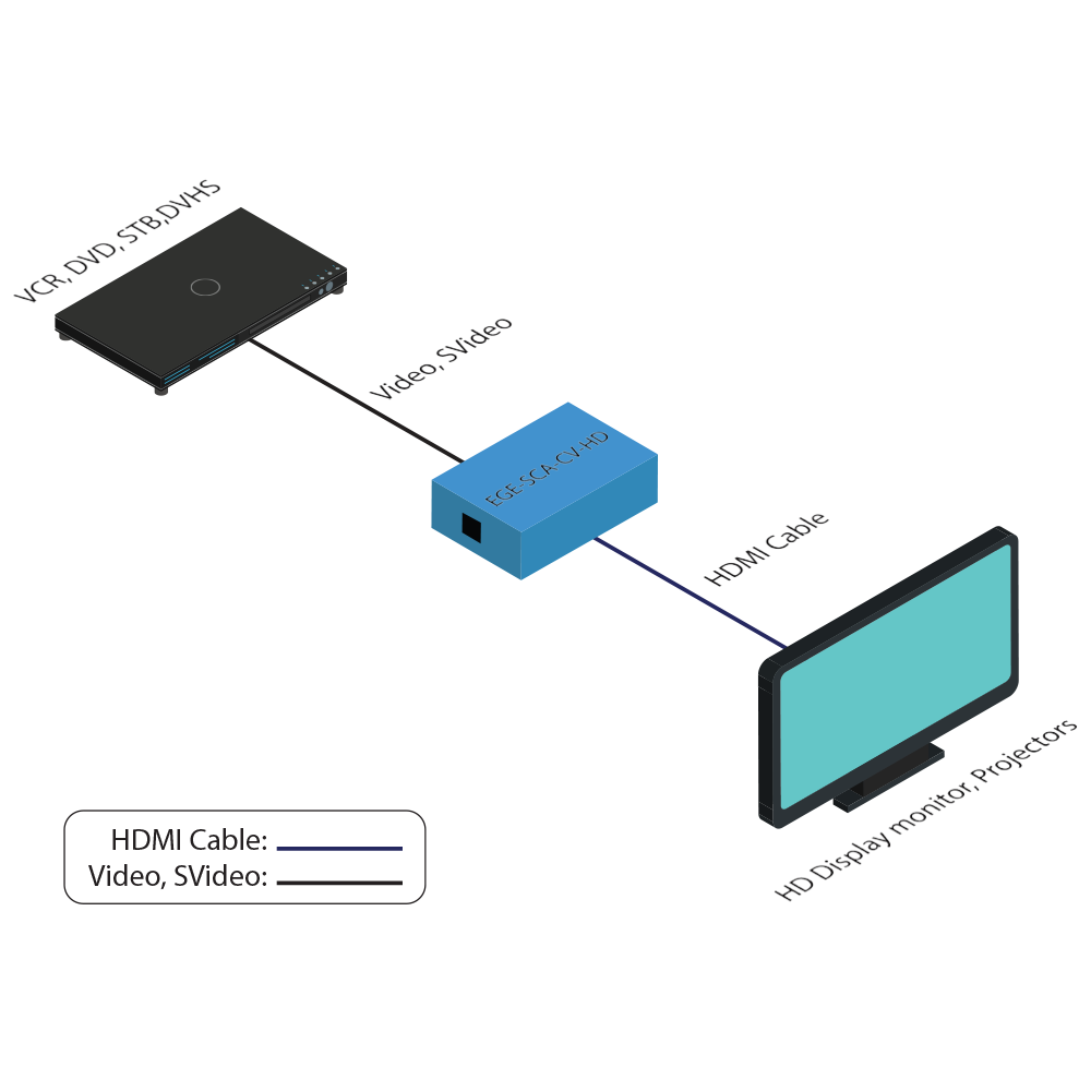 The EGE-SCA-CV-HD Video to HDMI Scaler Box is designed to scale CVBS and S-Video with R/L audio into HDMI. Supporting PC timings up to WUXGA 1920 x 1200 at 60Hz and HD timings up to 1080p at 60Hz. Supporting the NTSC and PAL TV standards and allowing you to select the specific video timing through the OSD, this device has many features that enhance the quality of your videos.