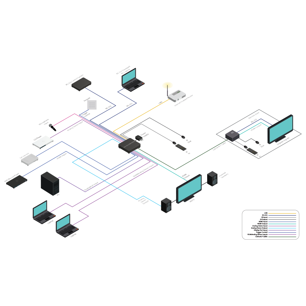 This HDMI/DP/HDBaseT to HDMI/HDBaseT Scaler supports five inputs including HDMI, VGA, and DisplayPort. Any selected source will be scaled to your preferred resolution for output over HDMI and HDBaseT. HD resolutions up to 1080p@60Hz are supported. This unit also provides audio application flexibility by including multiple unbalanced audio inputs, a 1/4” mic input (with support for optional 48V phantom power) and one line out port. This unit contains an audio DSP engine with auto-mixer and auto-gain functionality, allowing for the mic source to be mixed with the audio from one of the video sources while reducing the background audio in order to enhance the primary audio source. The HDBaseT output provides 24V PoC (Power over Cable) allowing compatible PoC powered HDBaseT Receivers to operate without needing a local power connection. This unit can be easily controlled and configured through the front panel with OSD, IR remote control, RS232, Telnet, or WebGUI. This unit is an ideal solution for presentations in classrooms and conference rooms.