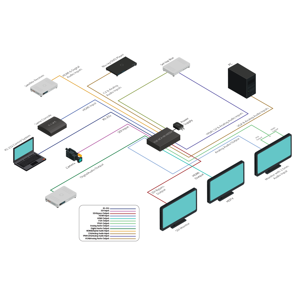 This unit is an advanced HDMI, VGA, SDI, Composite Video, S-Video, and Component Video switcher/scaler. This device can scale and switch input sources and display them to its HDMI and PC (VGA)/HD (Component Video) outputs simultaneously, with their associated audio signals, at a wide range of output resolutions up to 1080p or WUXGA (RB). It also has the added benefit of an SDI Loop-through output for monitoring or extending the SDI input signal. Control is via the IR remote, RS-232, or via front-panel buttons and includes an on-screen menu (OSD) providing settings and system information.