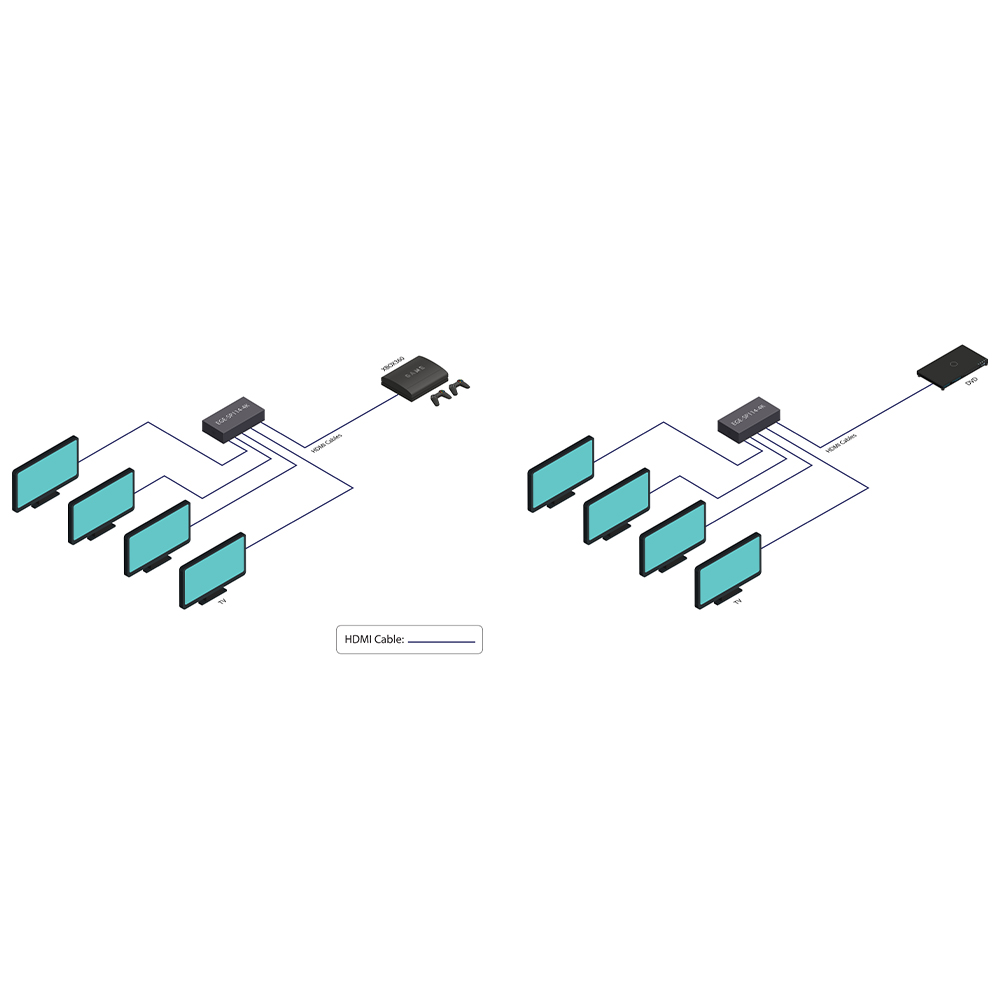 • 1 HDMI input signal split to 4 HDMI sink devices.