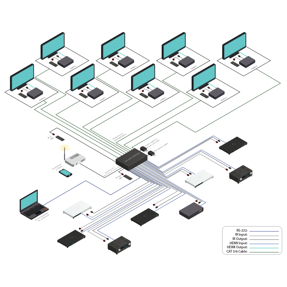 The 4K2K 8 by 8 HDMI Matrix over CAT5e/6/7 supports the transmission of video (resolutions up to 4K2K Full HD), multi-channel digital audio and control via IR, RS-232, Telnet or Web GUI from eight high definitionsources to eight outputs over a single CAT5e/6/7 cable (up to 100m) for each output. It supports high resolution digital audio formats such as LPCM 7.1CH, Dolby TrueHD, Dolby Digital Plus and DTS-HD Master Audio as well as 3D content that can be displayed when connecting a 3D TV and 3D source. Additionally, the LAN connectivity will allow a 100BaseT network to be served to smart TVs or games consoles. The Power over Cable (PoC) function can power compatible receivers, providing greater flexibility in installations