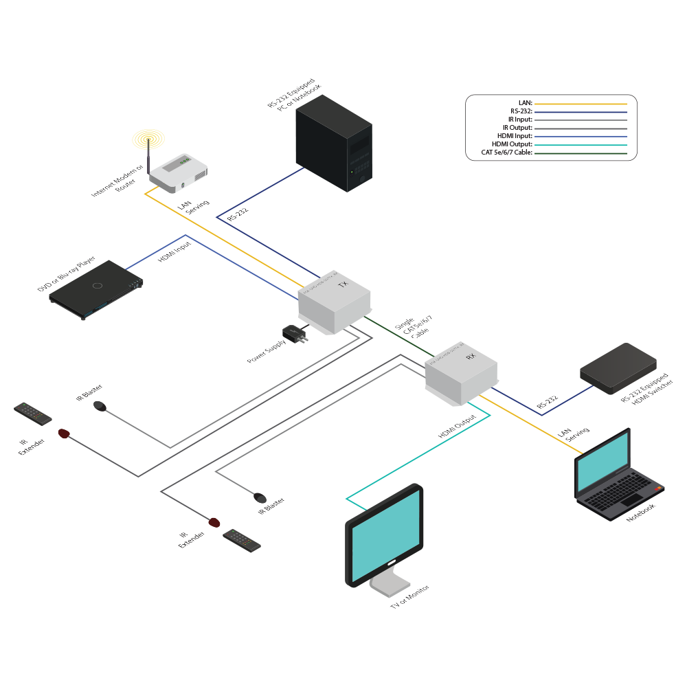 The HDMI over CAT5e/6/7 Transmitter and Receiver set can send uncompressed video/ audio and IP data over an single run of CAT5e/6/7 cable up to 100 meters. It has the added benefit of control through the built-in RS-232 pass-through and 2-way IR control and a LAN serving connection. Additionally, it has Power over Cable (PoC) functionality that allows for greater flexibility in installations.