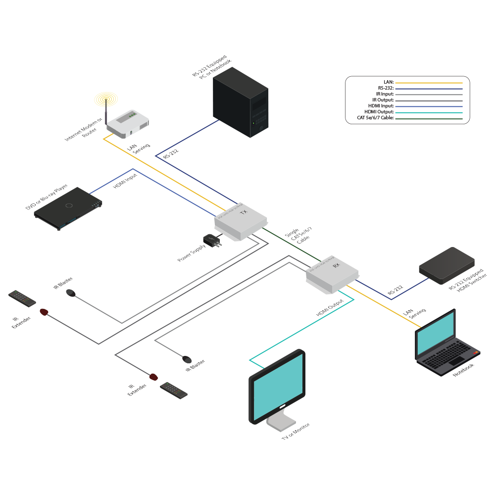 The HDMI over CAT5e/6/7 Transmitter and Receiver set can send uncompressed video/ audio and IP data over an single run of CAT5e/6/7 cable up to 100 meters. It has the added benefit of control through the built-in RS-232 pass-through and 2-way IR control and a LAN serving connection. Additionally, it has bi-directional Power over Cable (PoC) functionality that allows for greater flexibility in installations.