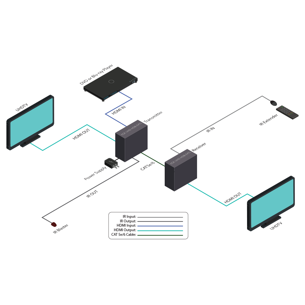 The HDMI 18Gbps Extender can extend high definition video / audio signal and one-way IR, and the distance is up to 164ft / 50 meters between transmitter and receiver over a single Cat5e/6 cable. It supports resolution up to 4K2K@60Hz 4:4:4, 18Gbps and HDCP 2.2. In addition, the extender is equipped with one-way IR pass-through which allows for source control and one HDMI loop output. The extender includes two units: transmitter unit and receiver unit. The transmitter unit is responsible for capturing HDMI input signal and carries the signal via one cost effective Cat6 cable, and emitting IR control signals. The receiver unit is responsible for receiving the HDMI signal and transmitting IR control signal. The extender offers the most convenient solution for HDMI extension over a single Cat5e/6 with long distance capability, and is the perfect solution for any application.