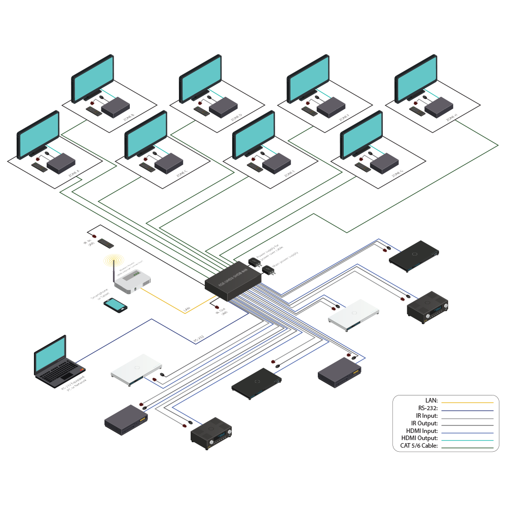The 8 by 8 HDMI 4K2K Matrix over CAT5e/6/7 supports the transmission of video (resolutions up to 4K2K Full HD & HDCP 2.2), multi-channel digital audio and control via IR, RS-232, Telnet or Web GUI from eight high definition sources to eight outputs over a single CAT5e/6/7 cable (up to 100m) for each output. It supports high resolution digital audio formats such as LPCM 7.1CH, Dolby TrueHD, Dolby Digital Plus and DTS-HD Master Audio as well as 3D content that can be displayed when connecting a 3D TV and 3D source. Additionally, the LAN connectivity will allow a 100BaseT network to be served to smart TVs or games consoles. The Power over Cable (PoC) function can power compatible receivers, providing greater flexibility in installations.