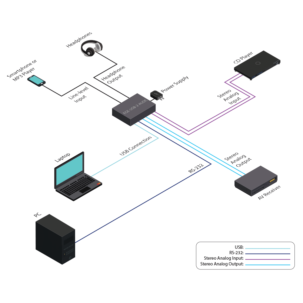 The USB Audio Center allows multiple audio sources to be controlled, switched and outputted to a variety of audio equipment. With 3 audio inputs (USB, Line-level RCA and 3.5mm mini-jack and 2 audio outputs (Line-level RCA and 6.3mm headphone output) you can integrate and convert USB or analog stereo audio sources to Line level output and 6.3mm headphone simultaneously.